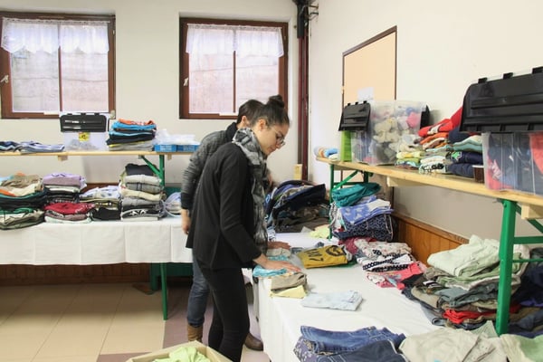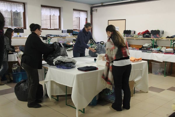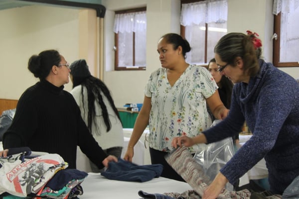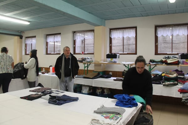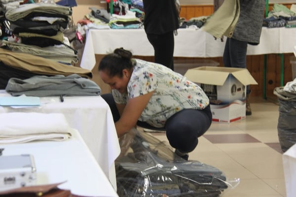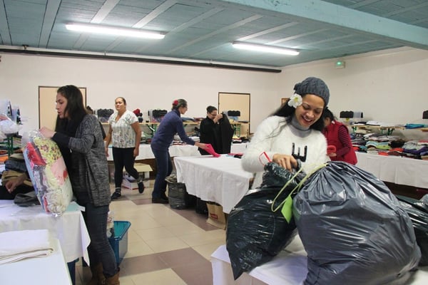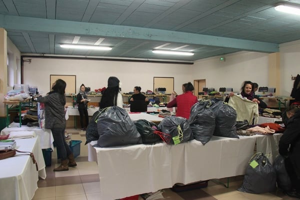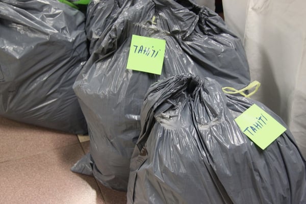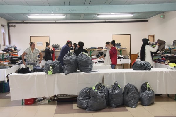 Plusieurs générations se retrouvent ici dans une ambiance chaleureuse, sur fond de musique tahitienne, pour trier, plier, classer, emballer les flots d'habits de toutes tailles qui arrivent en nombre.