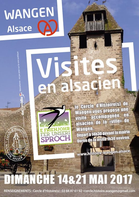 Dans le cadre de E friehjohr fer unseri sproch 2017, le printemps de la langue régionale, le Cercle d'Histoire(s) de Wangen vous propose une visite accompagnée en alsacien du village les dimanches 14 et 21 mai de 14h30 à 16h.