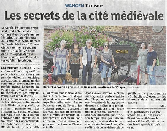 actualité 2017 · 12 juillet 2017 Visites commentées du village Eté 2017 Le Cercle d'Histoire(s) de Wangen vous propose une visite commentée de la cité médiévale d'une heure 30 environ, tous les mercredis à 17 h du 12 juillet au 23 août 2017. Rendez-vous devant la mairie ! tagPlaceholderCatégories : histoire, village, alsace, bas-rhin, cercle, patrimoine, visite, wangen Écrire commentaire Commentaires: 0