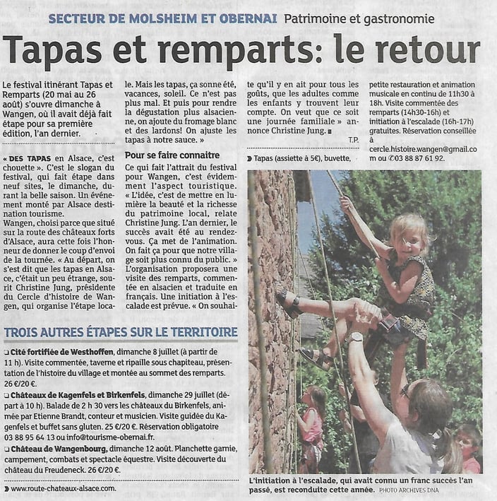 Wangen fait partie des 9 sites de la route des châteaux et cités fortifiées d'Alsace qui participent au festival du 20 mai au 26 août.