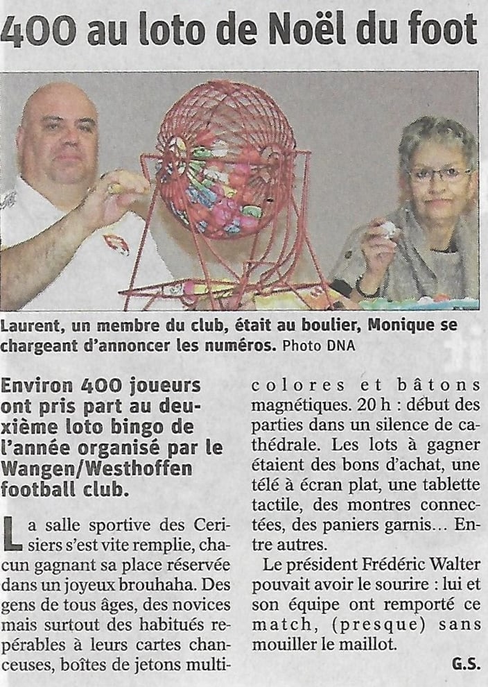 Samedi 30 novembre 2019 à 20h, le football club de Wangen-Westhoffen organise un loto de Noël dans la salle des fêtes "les cerisiers" de Westhoffen.