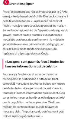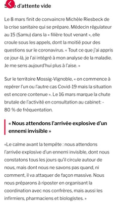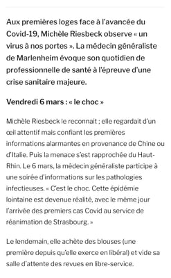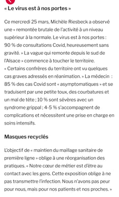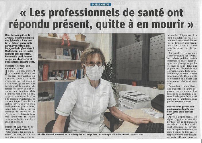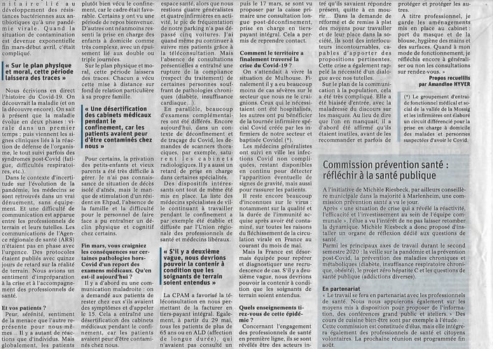Dans les DNA du 25 juillet, le Dr Michèle Riesbeck fait part de son expérience et de ses constats sur la crise sanitaire des 4 derniers mois, en particulier sur notre territoire.