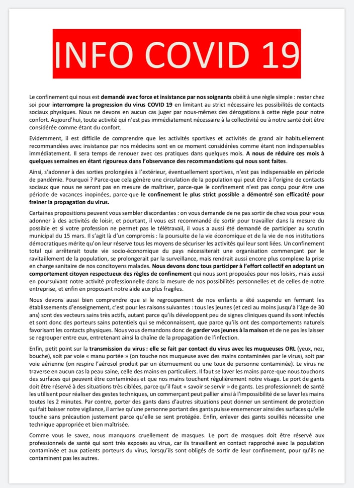 J’ai cherché comment élargir le message que je diffuse dans ma consultation à une population plus large et j’ai eu l’idée d’un tract dont j’ai écrit le texte d’un jet, reprenant les éléments de langage que je développe au quotidien depuis 2 semaines.