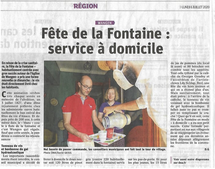 Pour la 193 ème édition, la tradition a été respectée et la promesse faite aux habitants en 1827 tenue, dans le contexte de la crise sanitaire en suivant les gestes barrières et en évitant les regroupements. Le conseil municipal a apporté et proposé le vin aux habitants devant leur maison dès 10h. Le circuit est passé rue du moulin,rue des vignerons, rue des jardins, rue des lilas, rue du colonel Moll, place de l'église, rue basse, rue du château, rue du lieutenant Heid, rue des vignes, rue Georges Strohl, route de Molsheim. Pour les autres rues et impasses, les conseillers sont allés à la rencontre des habitants..