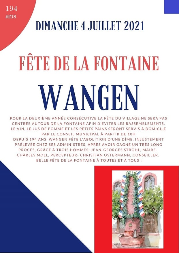 La prestation abusive était abolie, et la joie fut immense dans notre village. Pour perpétuer le souvenir de cette heureuse issue du procès, le Conseil municipal de l’époque fit ériger une fontaine et décida que tous les ans, le 3 juillet, si c'est un dimanche, ou le dimanche suivant le 3 juillet, la commune offrirait du vin à tous les citoyens et invités. Il fut également décidé que chaque année, le Maire rappellerait l’histoire, mais aussi la ténacité et l’esprit civique des trois conseillers qui ont défendu corps et âme la cause de WANGEN.