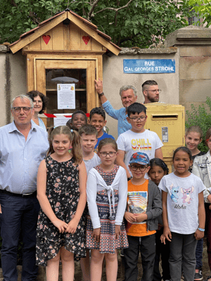 A Wangen c'est Florent, l'agent communal qui a transformé la vieille armoire repérée dans le sous-sol de la mairie par Geneviève, l'adjointe au maire, en une belle et robuste bibliothèque prête à essuyer tous les temps !