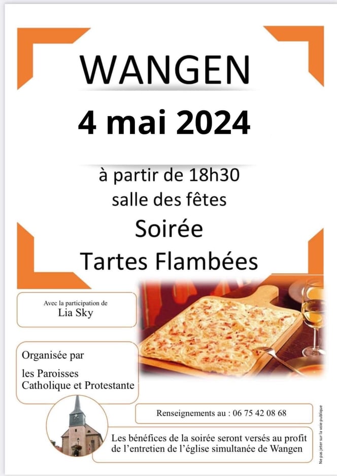 La traditionnelle soirée tartes flambées des paroisses catholique et protestante au profit de l’entretien de l’église simultanée de Wangen est prévue le samedi 4 mai à partir de 18h30 dans la salle des fêtes du village.