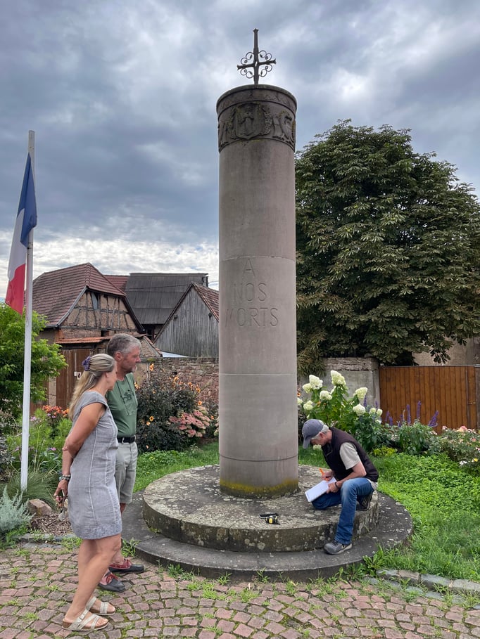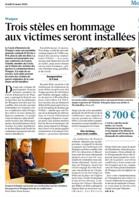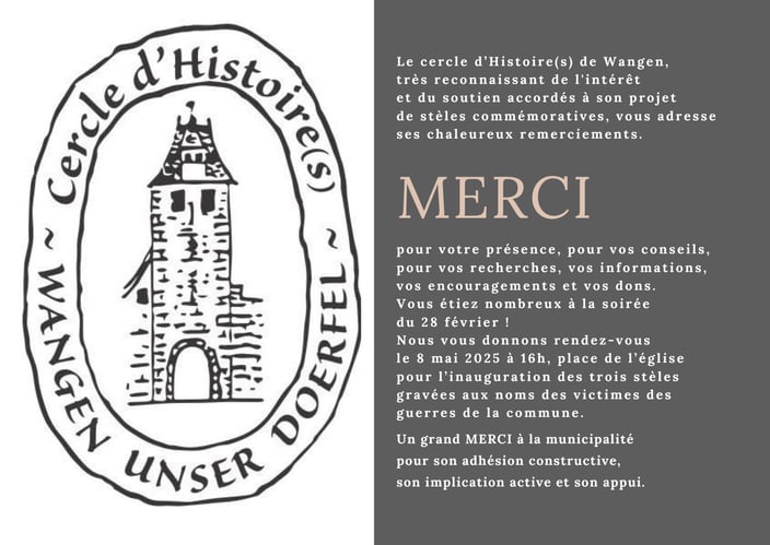 Informé par la municipalité, le cercle d'Histoire(s) de Wangen a envoyé un projet qui lui tenait à cœur, celui de stèles commémoratives gravées aux noms des victimes des guerres complétant la colonne du monument aux morts sans noms.