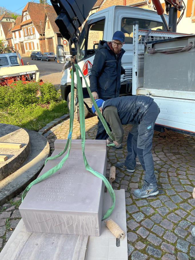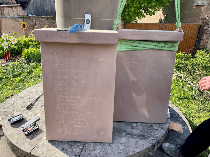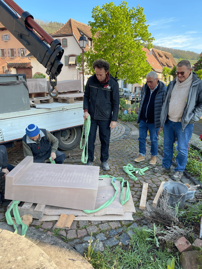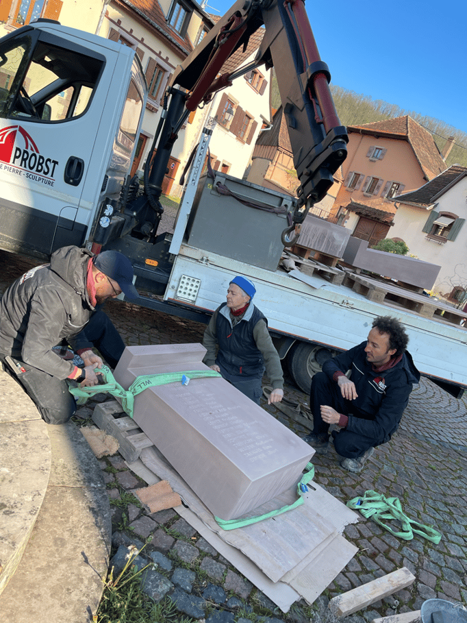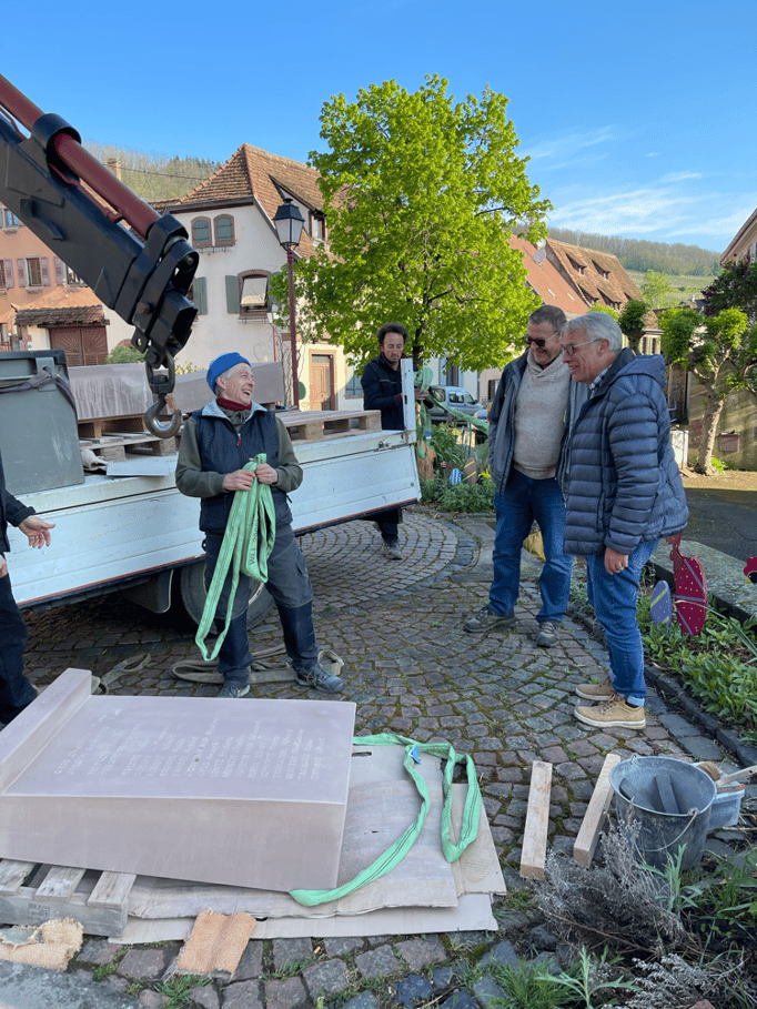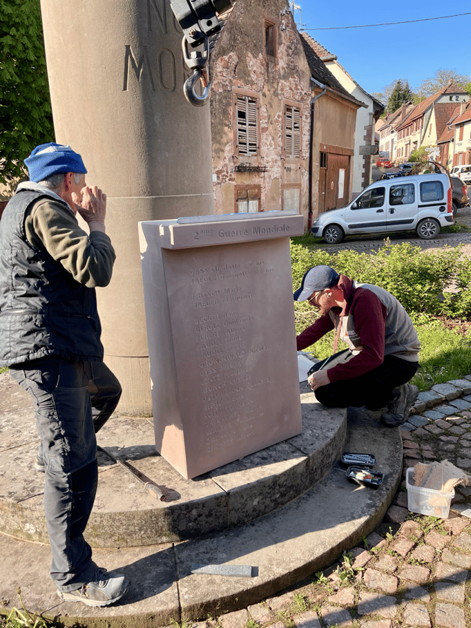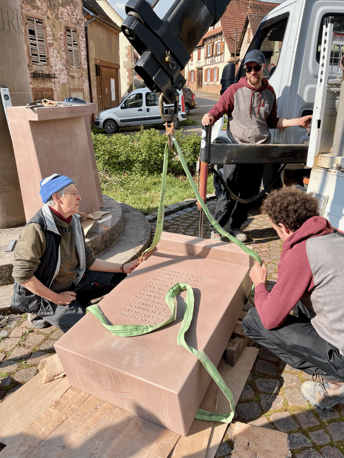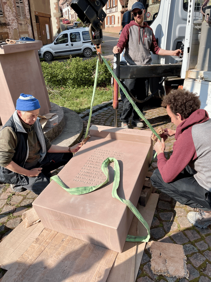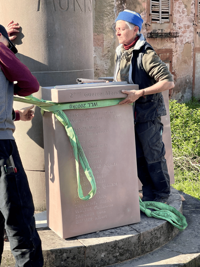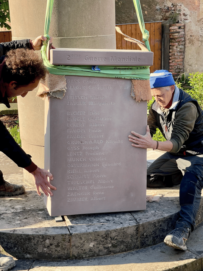 Fin 2024, le cercle d'Histoire(s) commande trois stèles gravées de 550 lettres à Violette Arbogast, tailleur de pierres à Westhoffen. (Wangen apprécie les tailleurs de pierre de Westhoffen !)