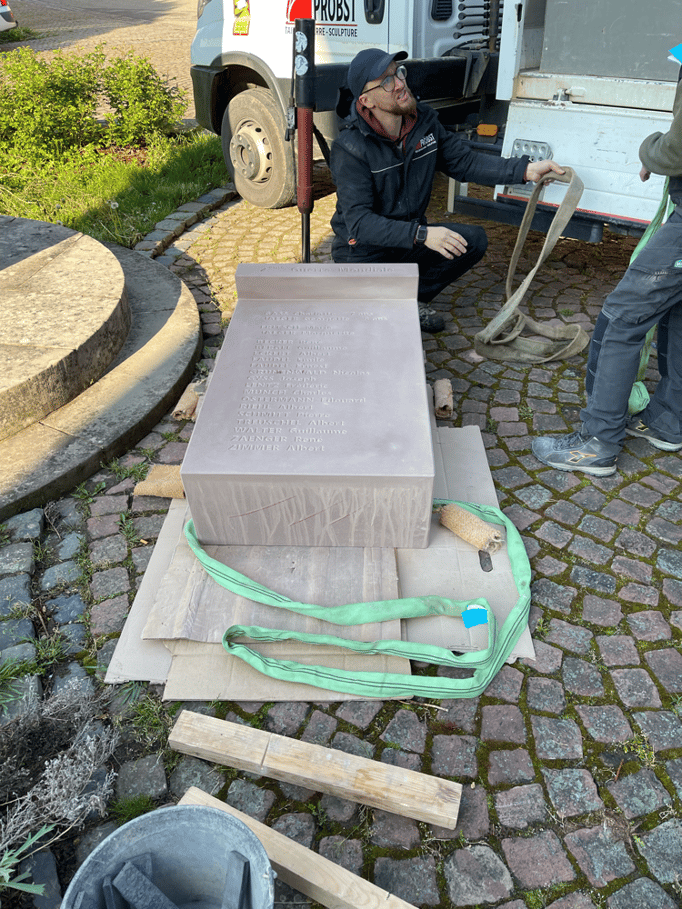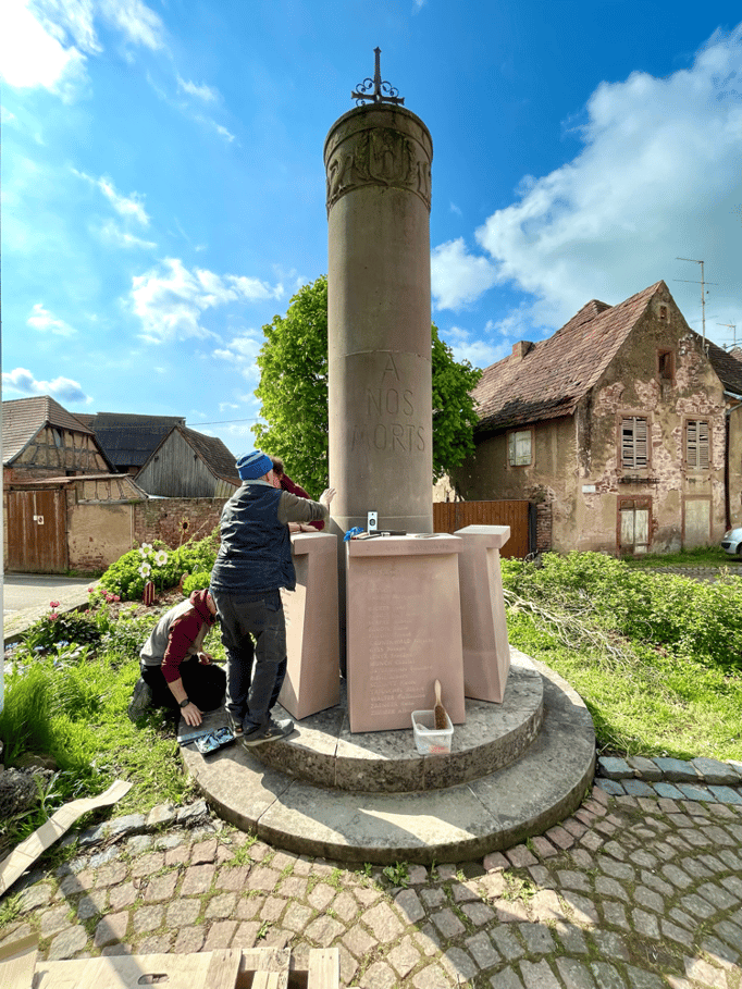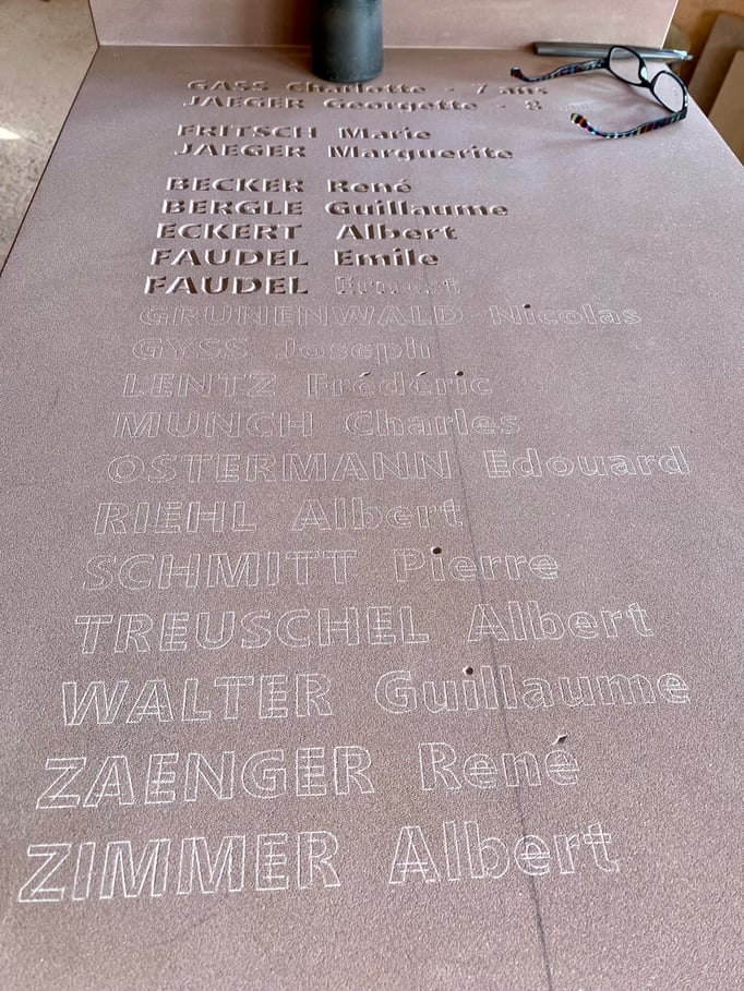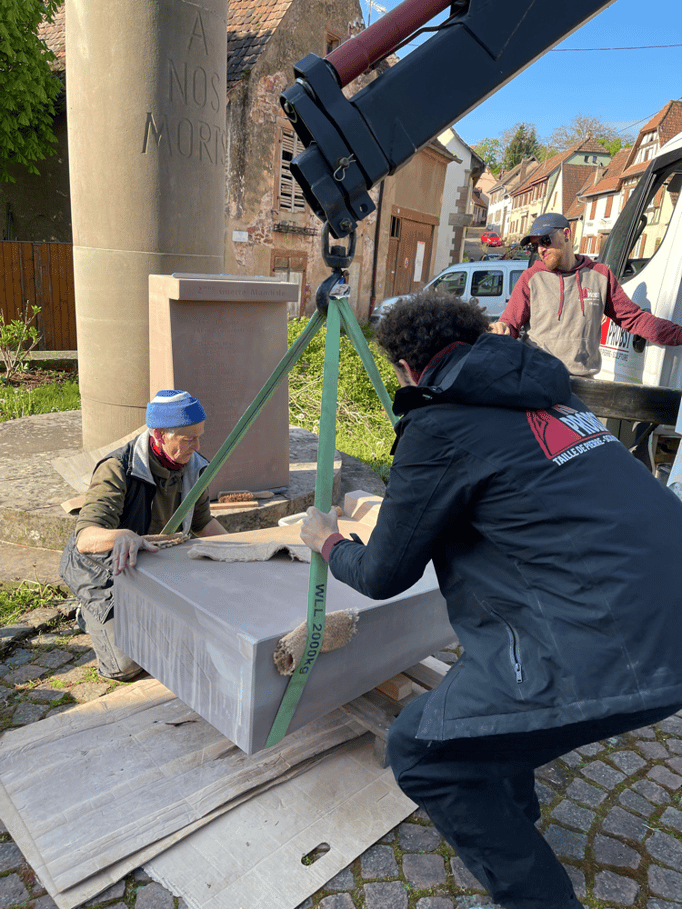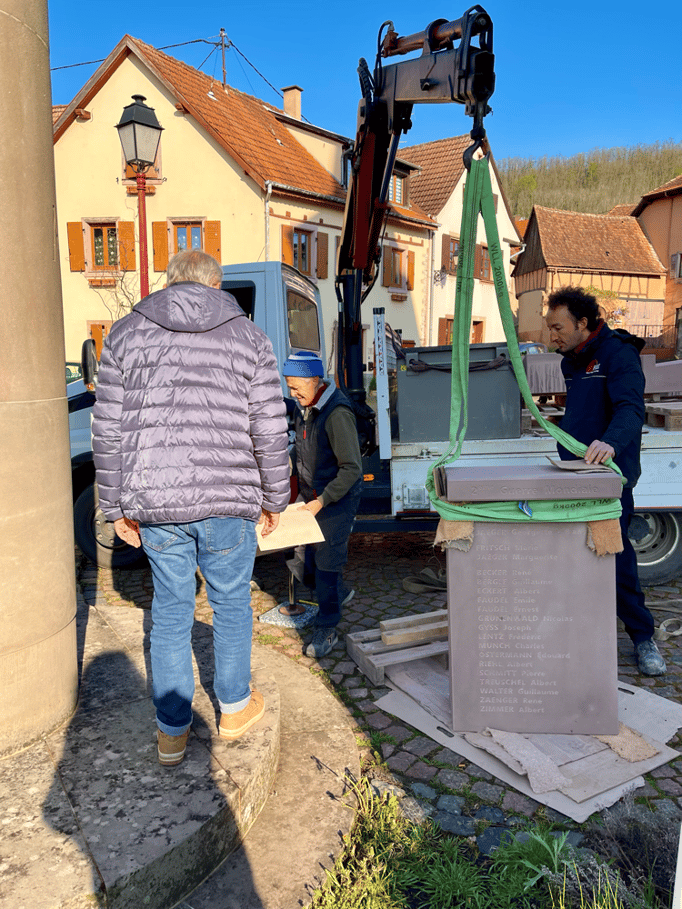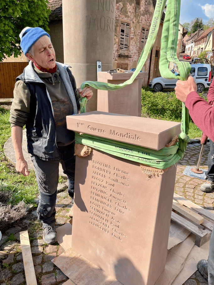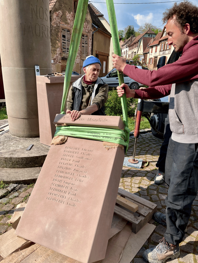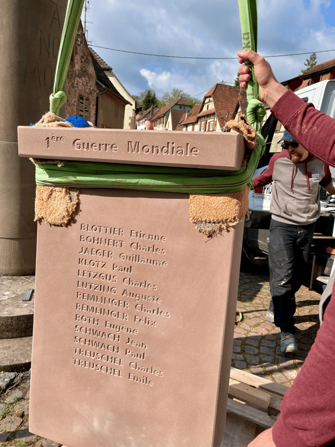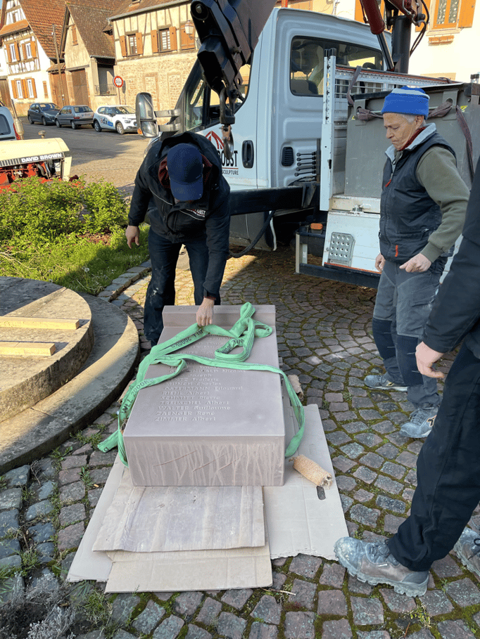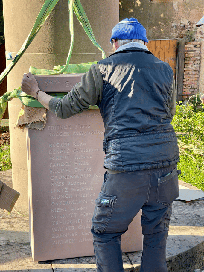 Fin 2024, le cercle d'Histoire(s) commande trois stèles gravées de 550 lettres à Violette Arbogast, tailleur de pierres à Westhoffen. (Wangen apprécie les tailleurs de pierre de Westhoffen !)