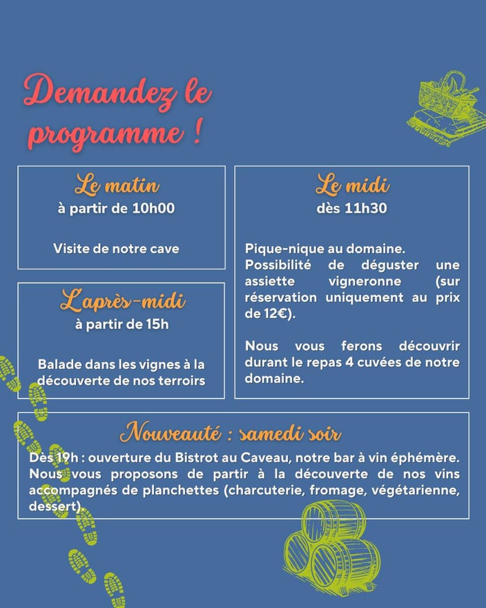 Dès 11h30, pique-nique chez le vigneron, vous pouvez apporter votre repas ou réserver une assiette vigneronne à 12 euros. La vigneronne vous fera déguster 4 de ses cuvées durant le repas !