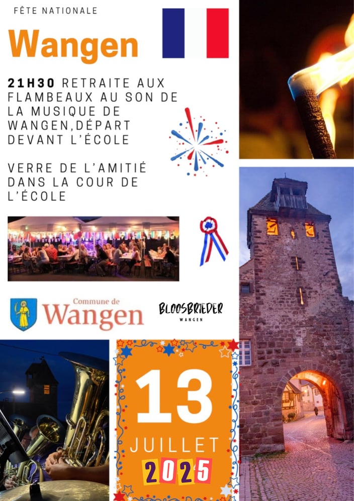 En cette veille de la fête nationale, venez participer aux traditionnelles festivités organisées par la municipalité en compagnie des Bloosbrieder de Wangen.