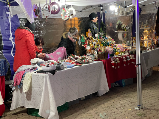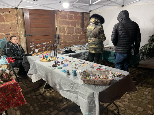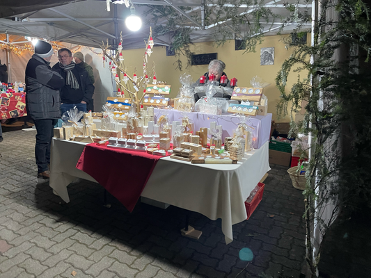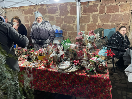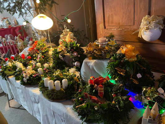 -27 stands artisanaux (objets de Noël en bois, bijoux, tableaux, céramique, broderie, couronnes de l’avent, miel….)