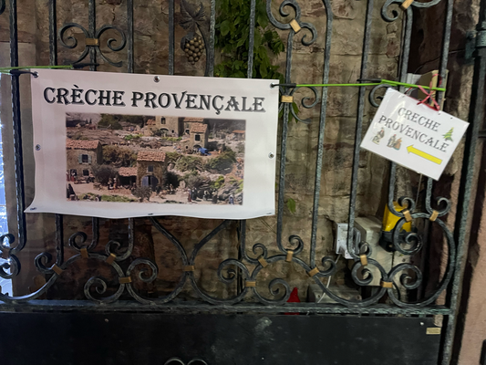Affichage des trois gagnants « fenêtres de Noël » devant la forge et l’exposition crèche et santons de Provence.