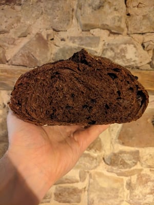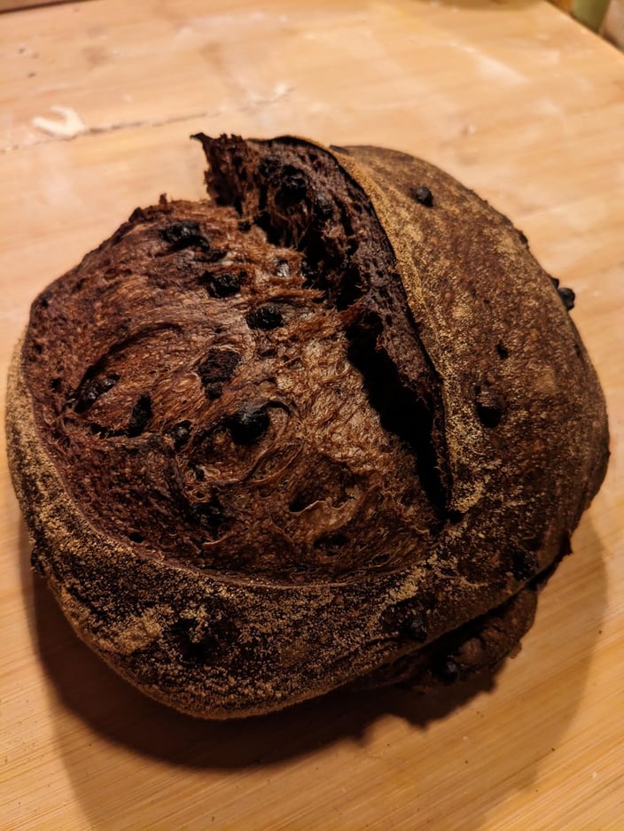 Pain au levain, seigle, blé, cacao et pépites de chocolat