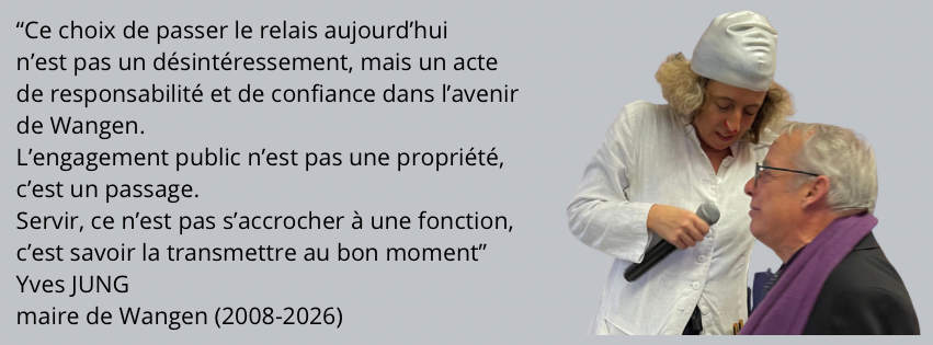 Après 18 années à la tête de la commune et 25 ans d’engagement au sein du conseil municipal, il a choisi de tourner une page importante de sa vie d’élu. Il souhaite favoriser le renouvellement des responsabilités locales et voir émerger de nouvelles énergies pour Wangen.