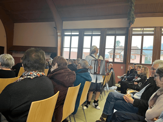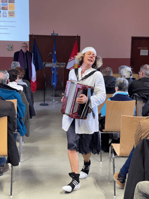Pour alléger l’atmosphère et prolonger l’après-midi, sur une note joyeuse, l'artiste clown Lily Schlap est intervenue, accordéon en bandoulière. Son humour et sa fantaisie ont offert une parenthèse pleine de fraîcheur, suscitant sourires et divertissements partagés.