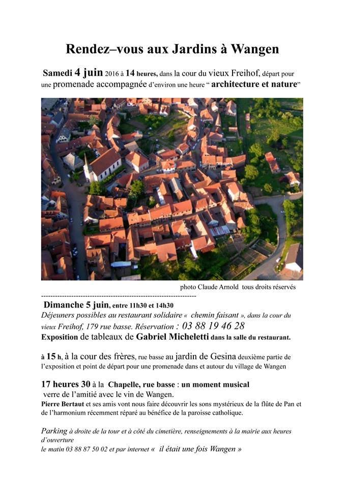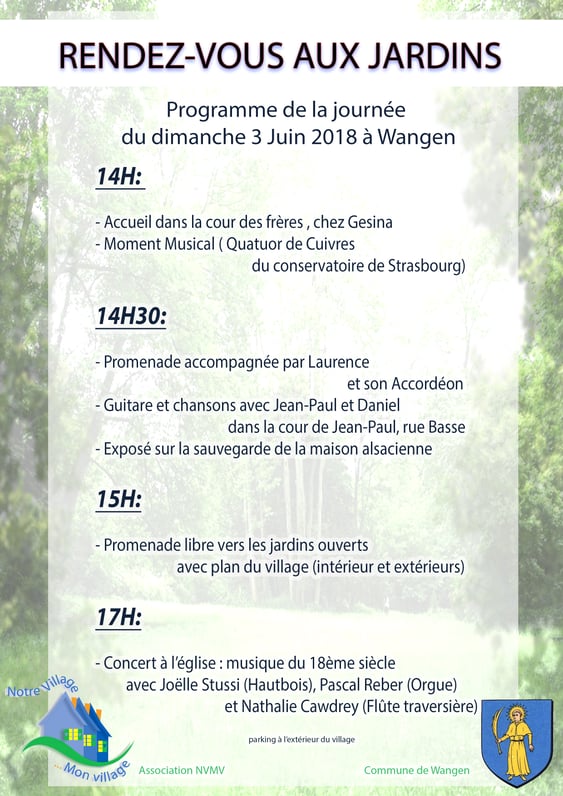 L'association " Découvrir" de Wangen propose une promenade accompagnée dans le cadre de la 14 ème édition des Rendez-vous aux jardins le samedi 4 juin à 14h et le dimanche 5 juin à 15h. Le thème retenu est "Architecture et Nature".