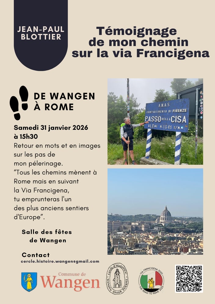 L'infatigable et sympathique pèlerin de Wangen, Jean-Paul Blottier nous racontera son dernier chemin au Portugal . Son précédent témoignage, "de Wangen à Compostelle", a été écouté et apprécié à plusieurs reprises au-delà du village et de la communauté de commune dans des salles combles. Il a l'art, la manière, la passion et l'humour pour décrire chaque situation vécue et nous la faire partager avec humilité. Son épouse, Marie l'accompagne dans cette démarche comme si elle...