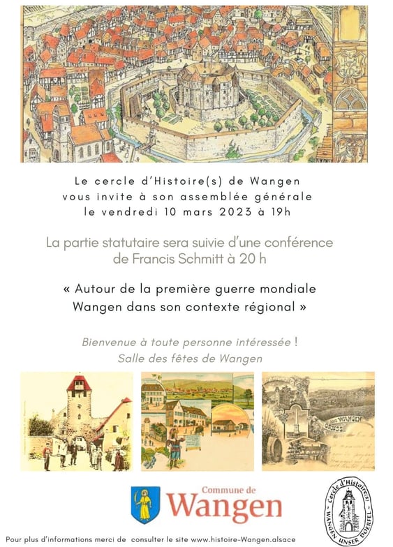 Le cercle d'Histoire(s) a le plaisir de vous convier à son assemblée générale publique le vendredi 22 mars à 19h30, salle des fêtes de Wangen où nous ferons le bilan de l'année 2023 et le tour des projets et animations 2024 de l'association dans le village. La partie statutaire sera suivie d' une intervention d'Isabelle Lorentz , originaire de Wangen qui nous présentera ses textes et ses photos concernant le destin bien particulier de deux de ses ancêtres du village. Sa petite fille...