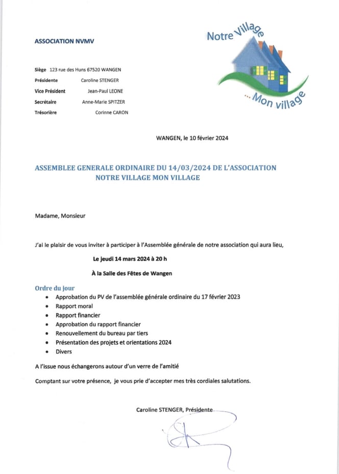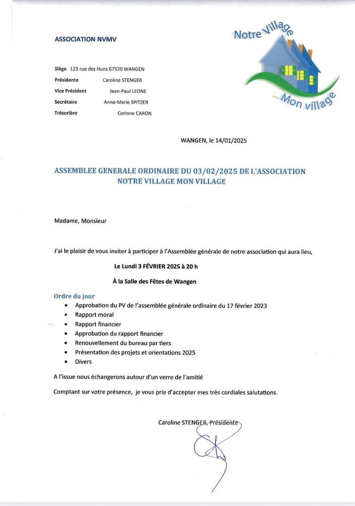 L'association "Notre Village Mon Village" invite toute personne intéressée à participer à son assemblée générale publique, salle des fêtes de Wangen lundi 3 février 2025 à 20h. Il y sera question du bilan de l'année écoulée et des projets de l’association sur différents évènements du village en 2025. S'inscrire dans la dynamique et le mouvement de NVMV est possible à tout moment. Profitez de l'AG 2025 pour faire connaissance avec les membres, les projets et pourquoi pas,...