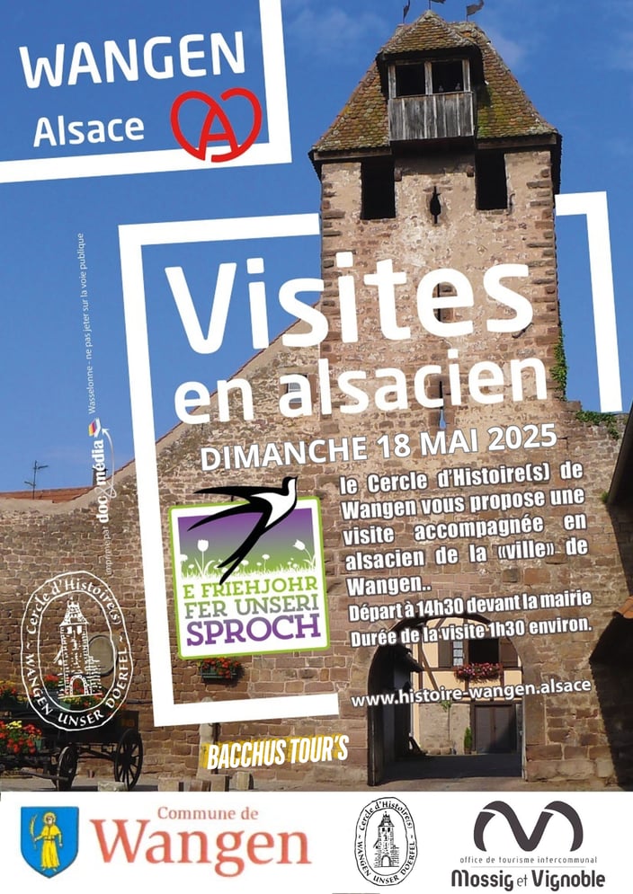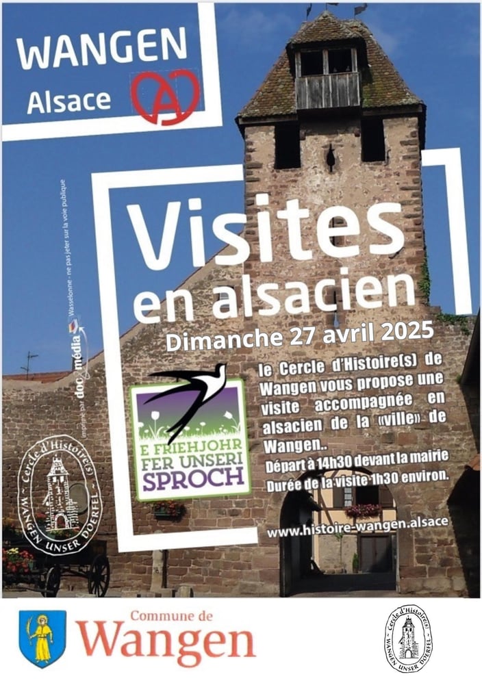 Pour ce 23 ème printemps de la langue régionale, dans le cadre de E Friehjohr fer unseri Sproch, le cercle d’Histoire(s) de Wangen vous propose sa visite traditionnelle en alsacien qui aura lieu le dimanche 27 avril 2025 à 14h30. La deuxième est programmée le 18 mai. Départ de la visite devant la mairie à 14h30 Traduction assurée en français. Cordiale invitation à tous !