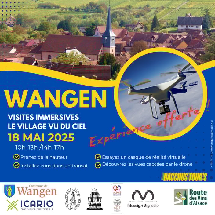 S'installer dans un transat, mettre son casque de réalité virtuelle et se laisser porter... Tout au long de la journée, Drone Alsace propose des séquences d'une quinzaine de minutes pour découvrir le village depuis le ciel, comme un oiseau en plein vol. Différentes vues de la ville fortifiée et de son environnement sont captées par drone et commentées en direct par des membres du cercle d'Histoire(s) de Wangen. Animation proposée par Alsace Destination Tourisme en partenariat avec la...