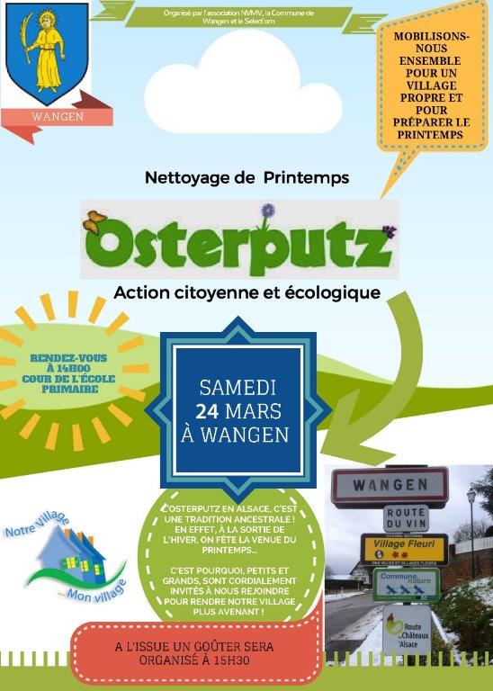 L'Osterputz est une tradition ancestrale en Alsace qui perdure à Wangen grâce à l'association Notre Village Mon village soutenue par la commune. et le Select'om. A la sortie de l'hiver, on fête le printemps en chargeant des sacs poubelle et en remplissant une action citoyenne de nettoyage au sein du village. L'engagement de chacun se renforce autour du désir de voir une planète propre sans déchets. En fournissant les gants, les sacs et en récupérant gratuitement les déchets le...