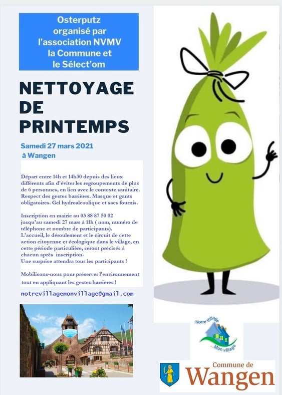 À l'arrivée de la belle saison, on procède au grand ménage de printemps. L’Osterputz est une tradition ancestrale en Alsace qui perdure à Wangen. À la sortie de l’hiver, on fête le printemps, en nettoyant les moindres recoins des maisons et des villages. C’est aussi utile que symbolique et témoignage d’une cohésion sociale. Pour ceux qui souhaitent donner un coup de main en nettoyant les abords du village, vous trouverez toutes les informations nécessaires sur le visuel...