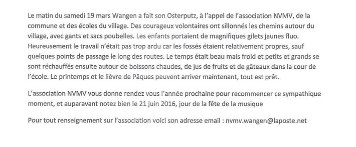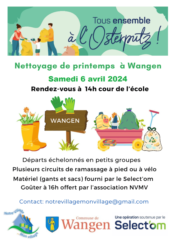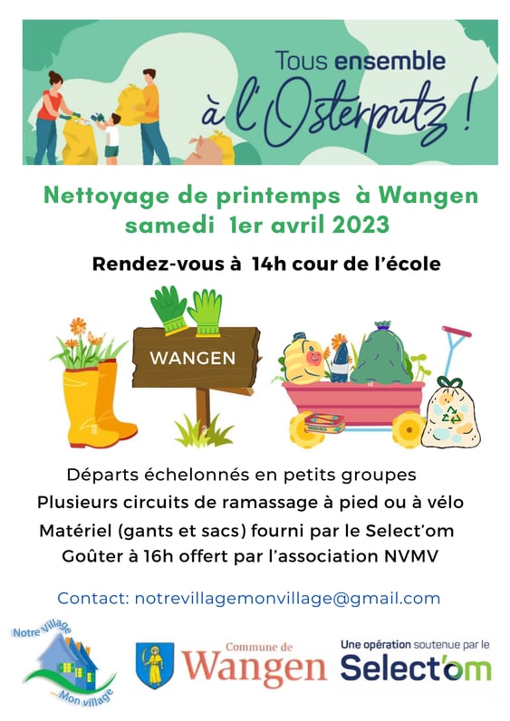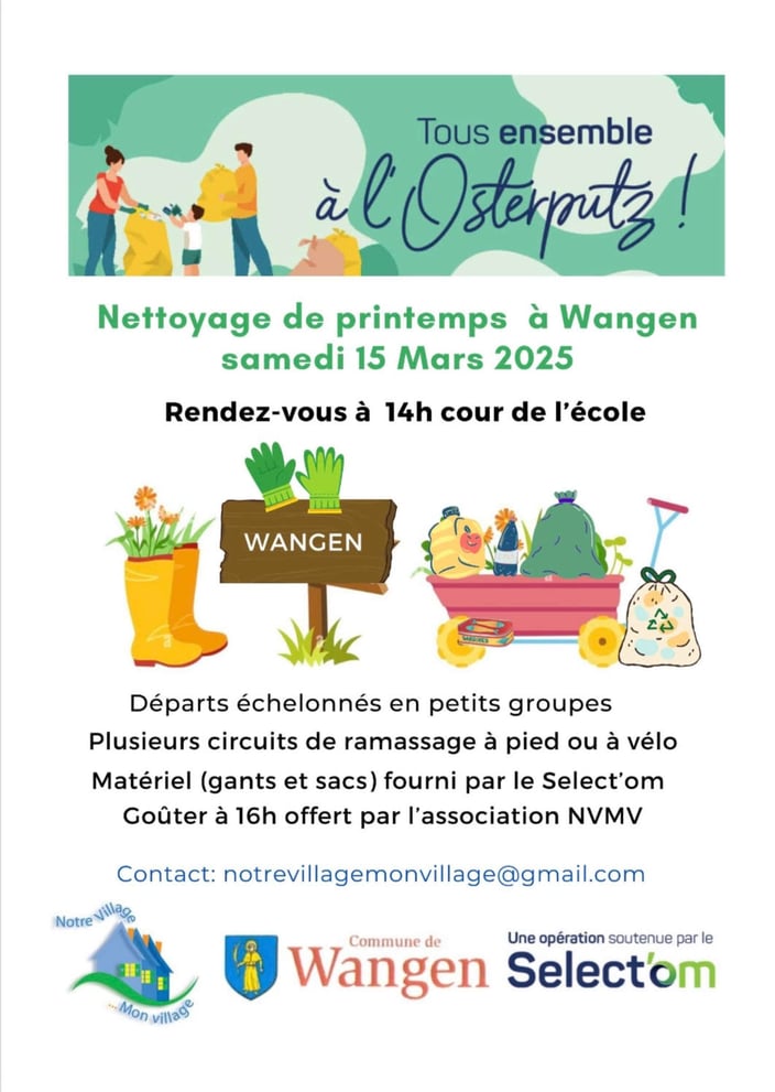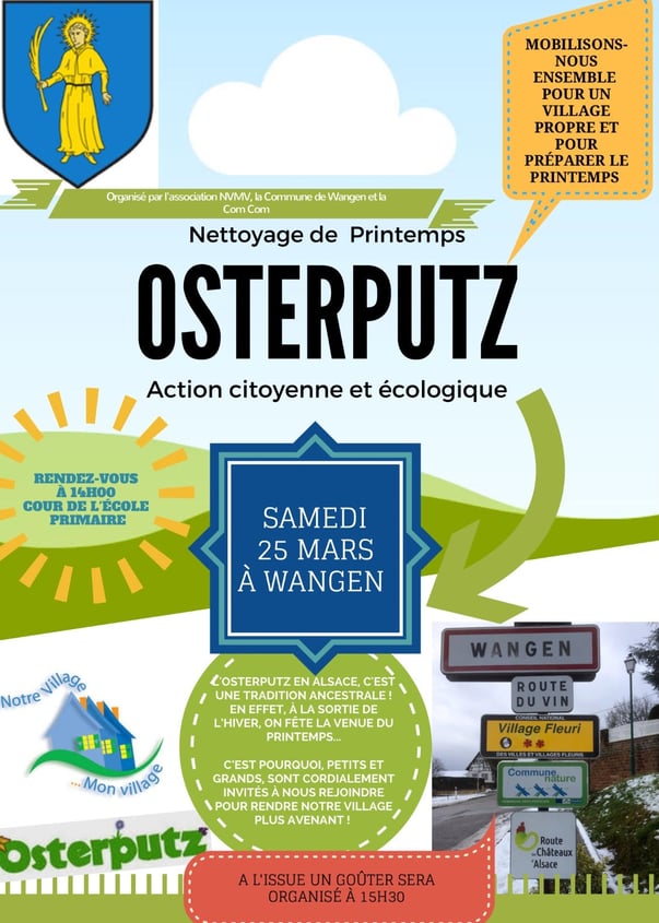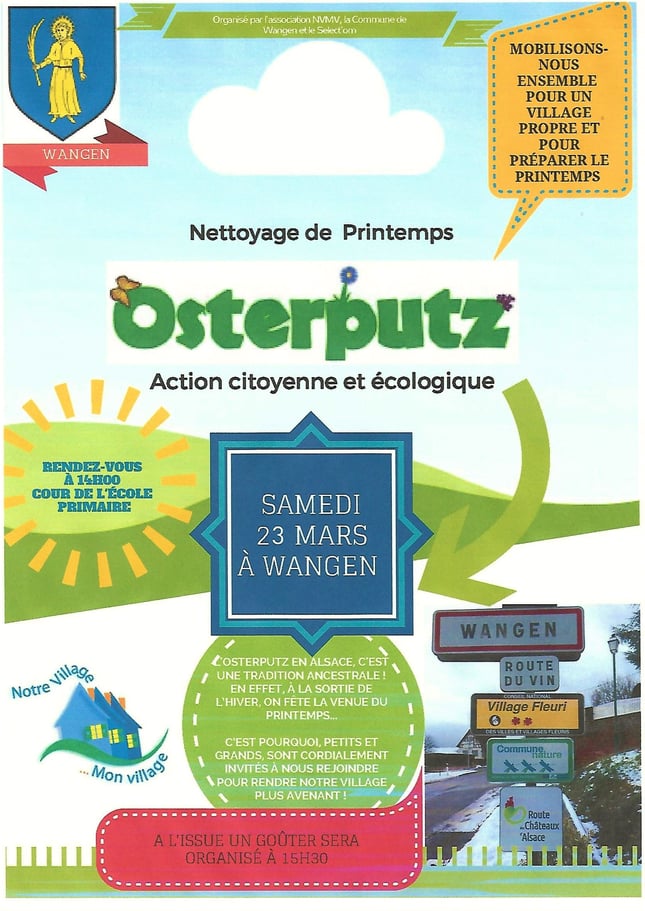 C'est l' Osterputz le samedi 25 mars à Wangen ! L'association Notre Village Mon Village invite petits et grands à rendre notre village encore plus avenant et à préparer le printemps tous ensemble. Au programme : - Rendez-vous à 14 h cour de l'école - Circuits organisés pour de petits équipes autour du village et dans la colline - Goûter à 15h30 Les sacs et les gants sont fournis. Les enfants sont sous la surveillance de leurs parents. L'organisation de la rencontre est faîte par...