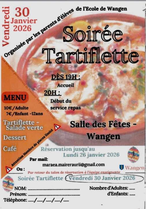 La tartiflette est un plat convivial et réconfortant, parfait pour se retrouver entre parents, amis, voisins, villageois avec bien sûr plein d'enfants autour de la table ! Et pas seulement à la montagne, les parents d'élèves de l'école de Wangen l'ont bien compris ! Avec le soutien de l'Association Sportive du Vignoble et de la commune de Wangen, ils organisent et préparent leur prochaine "Soirée Tartiflette" .