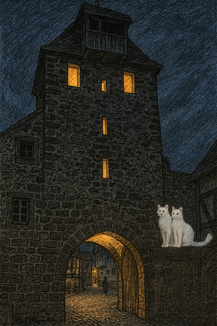 Grâce à eux, la famine étaient évitée. Depuis ce jour, on raconte que, de temps en temps, on aperçoit ces deux chats blancs, silencieux, sur le mur du cimetière de Wangen, aux premières lueurs du soir ou quand l’angélus sonne.