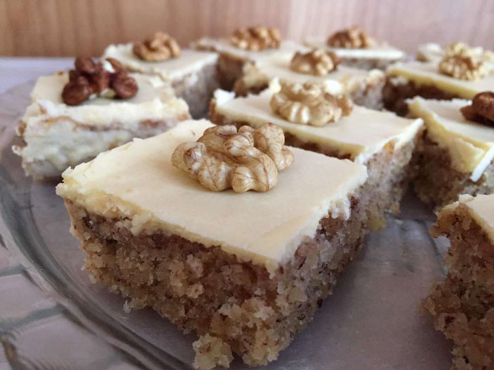 Pour le glaçage chauffer 3-4 cuillères à soupe d’eau, y diluer le café et le sucre glace. En badigeonner le gâteau et placer des cerneaux de noix puis